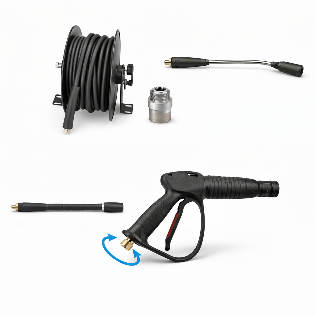 - Diseño ergonómico y funcional: Incluye alojamiento para pistola y lanza y soportes para cable y manguera, facilitando el orden, el transporte y el almacenamiento.